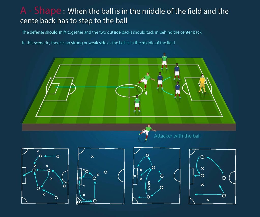 The center back makes the top of the A-shape. Outside backs tuck in.
